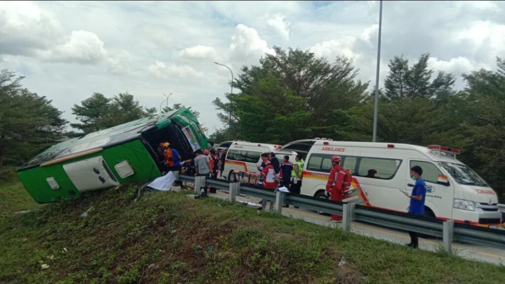 Bus berpenumpang 34 orang dengan tujuan wisata Guci, Kabupaten Tegal, diduga mengalami gangguan pada sistem pengereman saat melaju di tikungan jalur keluar tol, sehingga menabrak pembatas jalan dan terguling.