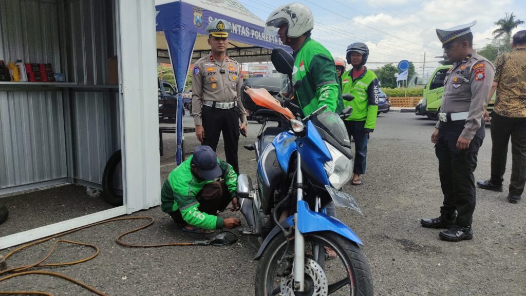 KEPOLISIAN dan pengemudi ojek online (ojol) di Kabupaten Sidoarjo bersinergi membuka kedai dan tempat tambal ban.
