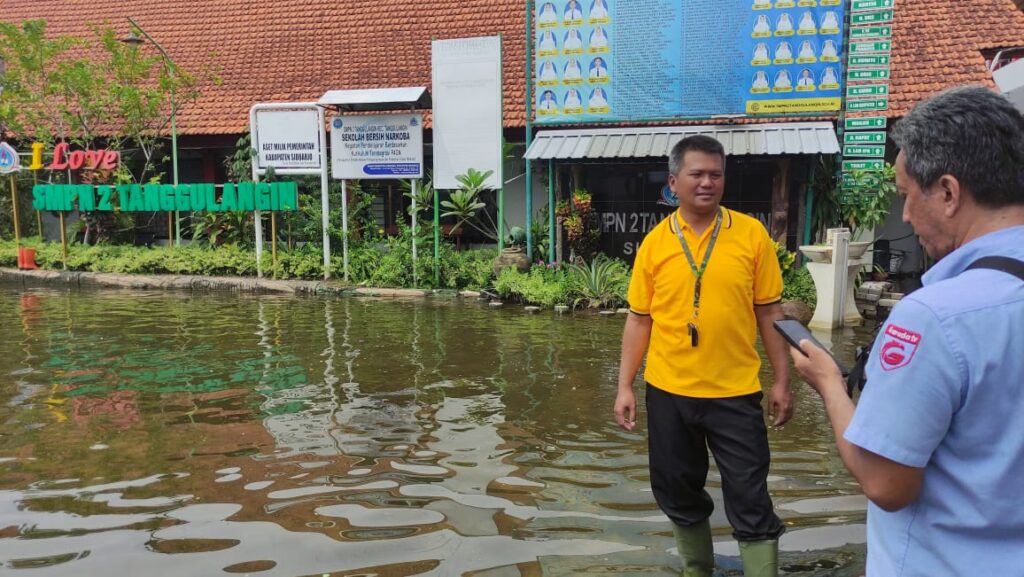 BANJIR yang menggenangi Sekolah Menengah Pertama Negeri (SMPN) 2 Tanggulangin Kabupaten Sidoarjo, sudah sepekan ini belum surut. Siswa pun terpaksa belajar daring.