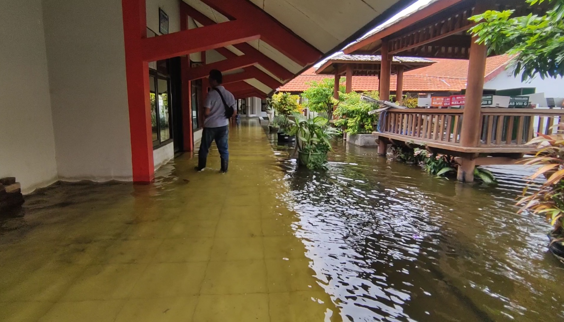 Sebanyak 652 siswa di SMP ini terpaksa harus belajar daring sejak Senin lalu (24/11). Para siswa baru akan masuk sekolah lagi, jika genangan banjir surut.