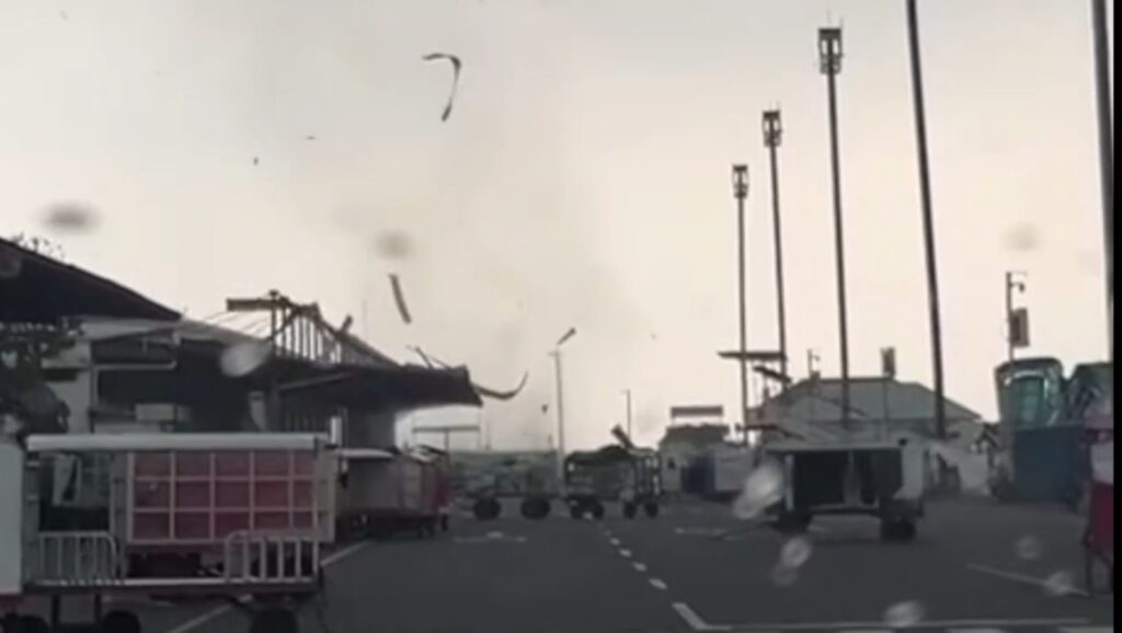 “Peristiwa angin puting beliung terjadi cepat, pohon bertumbangan, kurang dari lima menit,” kata Jefri, petugas parkir bandara.
