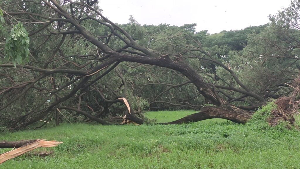 Satu kendaraan roda empat warna merah terlihat ringsek akibat tertimpa pohon. Sejumlah kendaraan roda dua juga tidak luput tertimpa pohon.