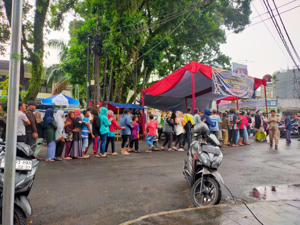 Pantauan di Taman Kota terlihat ratusan orang antre di tengah guyuran hujan dan mereka menerima paket berupa nasi kotak yang diberikan Ketua dari Komunitas Harley Davidson Club Indonesia (HDCI), Dandim 0612 Tasikmalaya, Letkol Czi Imvan Ibrahim, Kepala Dinas Kepemudaan, Olahraga, Kebudayaan dan Pariwisata Kota Tasikmalaya, Deddy Mulyana.