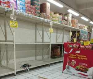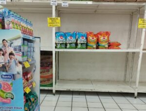 Dari pantauan di lapangan sendiri faktanya ketersediaan beras masih langka. Di beberapa supermarket, seperti Indomaret, Alfamart, atau Alfmart, rak-rak yang biasa dipenuhi beras masih kosong.