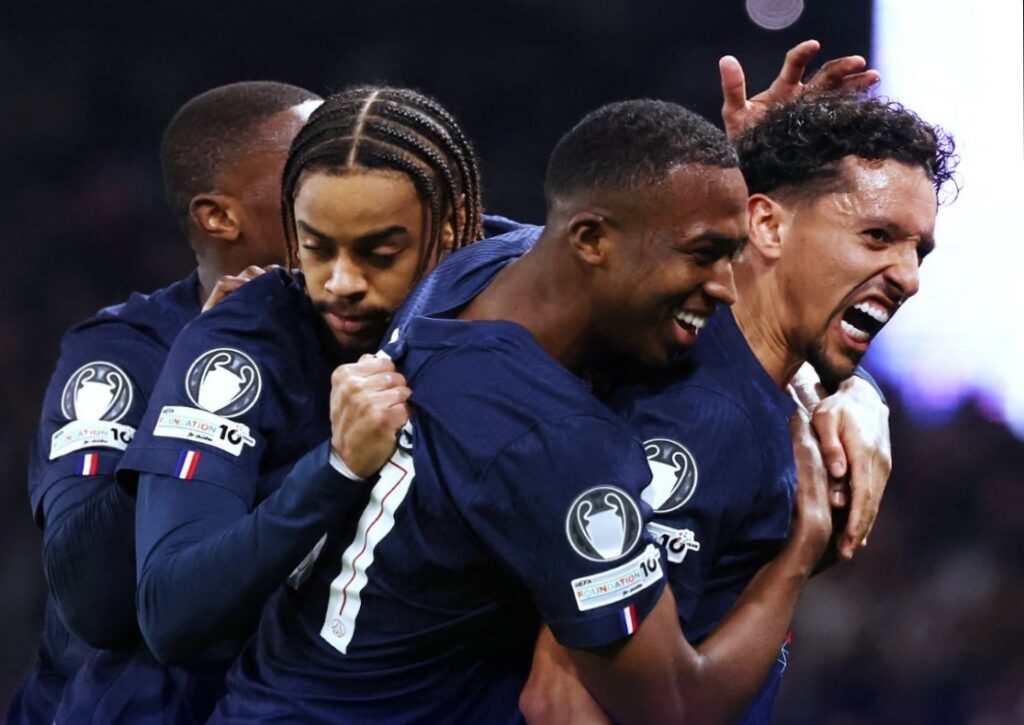 Para pemain PSG merayakan kesuksesan lolos ke 16 besar liga champoons. (Dok.uefa)