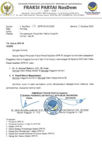 Pencopotan tersebut tertuang dalam surat Fraksi Partai NasDem Nomor 758 tentang pergantian anggota Komisi I dan Komisi III DPR, yang ditandatangani oleh Ketua Fraksi Viktor Laiskodat serta Sahroni selaku Bendahara Fraksi, pada 29 Agustus 2025.